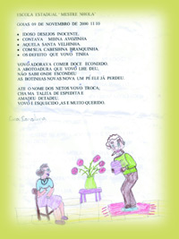 Nós, da Escola Estadual “Mestre Nhola”, estamos agradecendo por tudo que a senhora está fazendo por esses internos. Tudo que a senhora está fazendo vai ser benefício para sua vida espiritual junto a Deus. A senhora seja feliz e viva bem. E que Deus ilumine também todas as pessoas que ajudam essa entidade. (Alunos da 4ª série B)